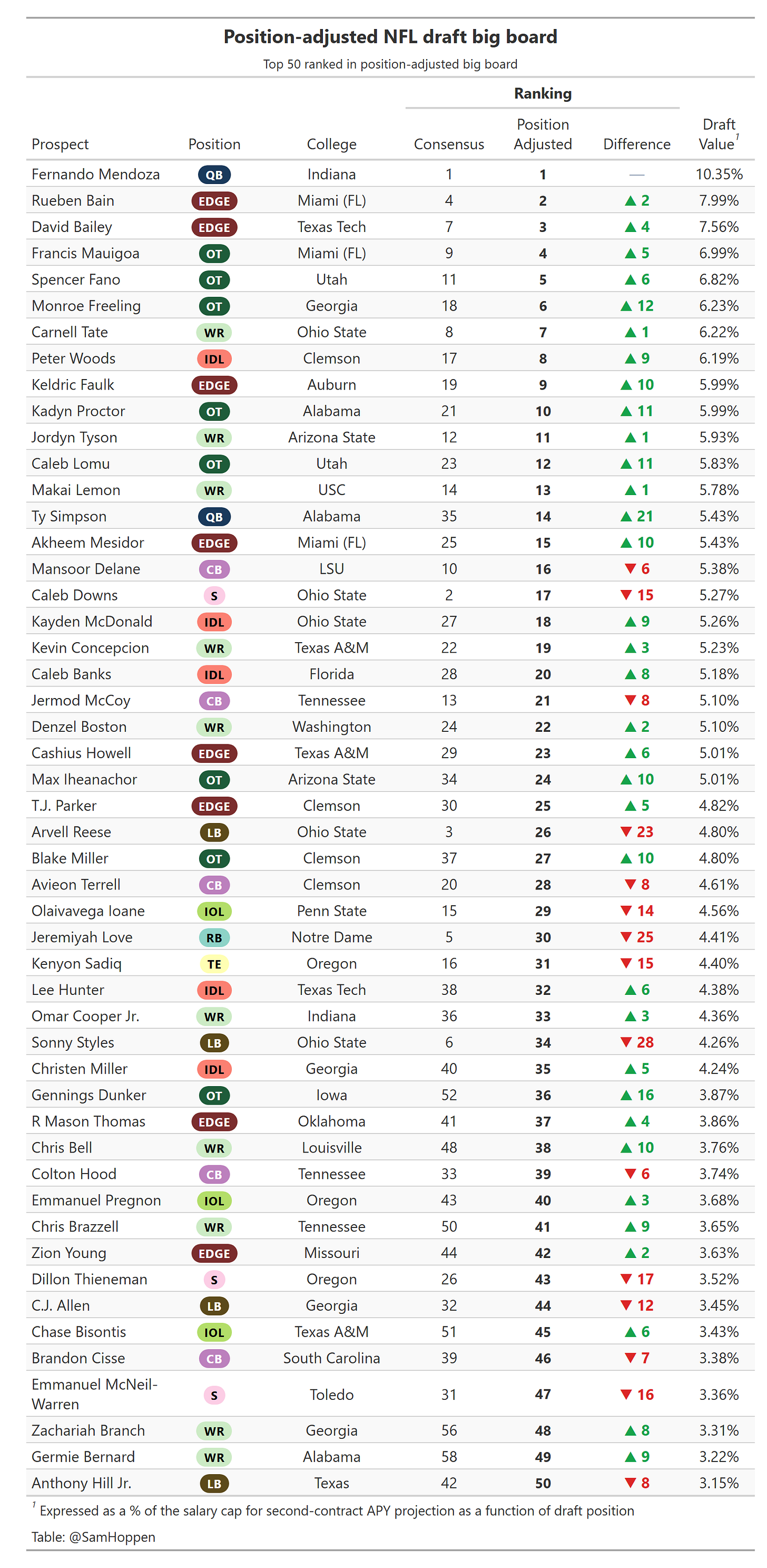 I mention this in the methodology below, but quarterbacks have a bit of an arbitrary value in the position-adjusted board. Fernando Mendoza remained at the top as he was already the consensus top player, but with the value that I chose for quarterbacks, you can see that Ty Simpson has also risen quite a bit. Some analysts have also linked Simpson to the Jets at 16th overall and this may suggest it’s not as much of a reach as some have said.