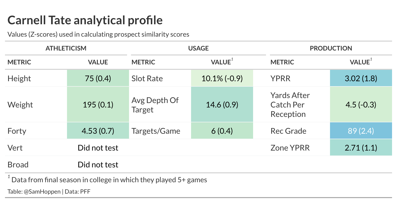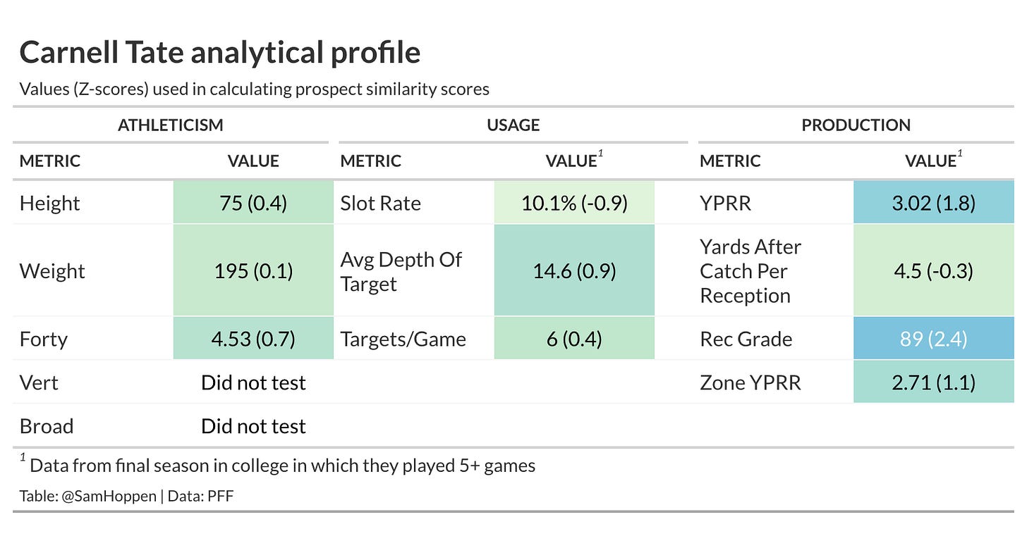 We have another year of wide receiver being extremely deep, but lacking a true alpha player at the position. Carnell Tate is the consensus WR1 and most likely to be drafted first, but it wouldn’t shock me if the outcome was different on draft day. I still don’t think this makes the position any less valuable or worth drafting highly, who you draft is going to matter more on your style of receiver. In that vein, I thought Ted Nguyen wrote a cool article ranking the receivers, but split by the type of player (X, Z, or slot) that they profile as. Hopefully my comps sync with how Ted identified them.